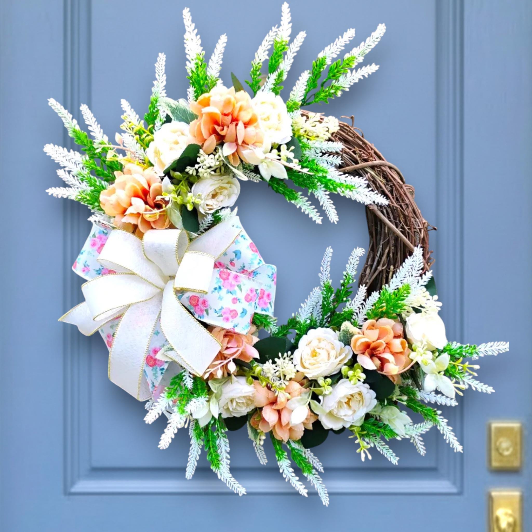 Welcome the seasons in style with this handcrafted peach and cream floral grapevine wreath! Bursting with soft peach blossoms, creamy white roses, faux greenery, and accented with a charming floral and gold-edged ribbon bow, this wreath brings elegance and warmth to any door or wall.