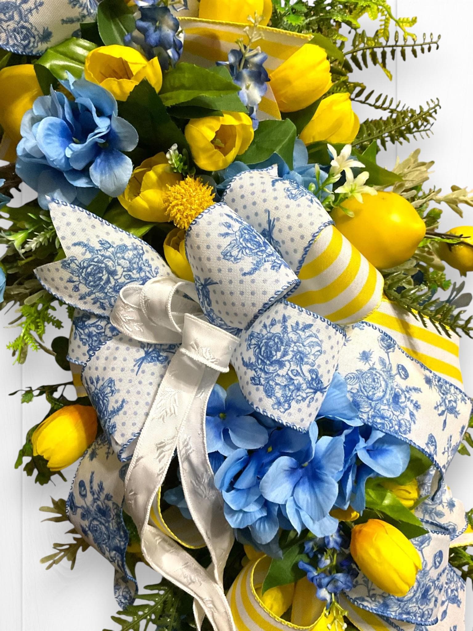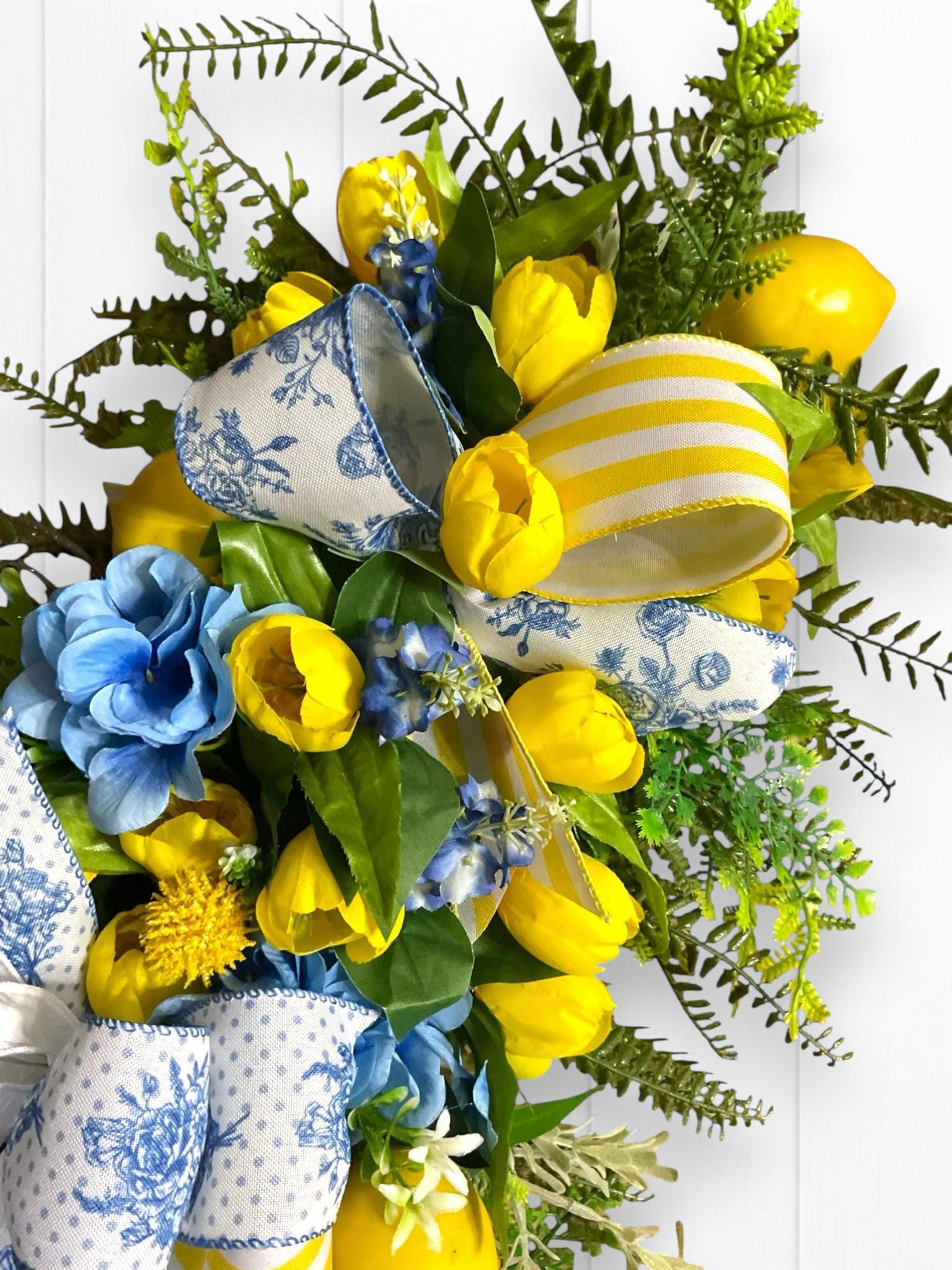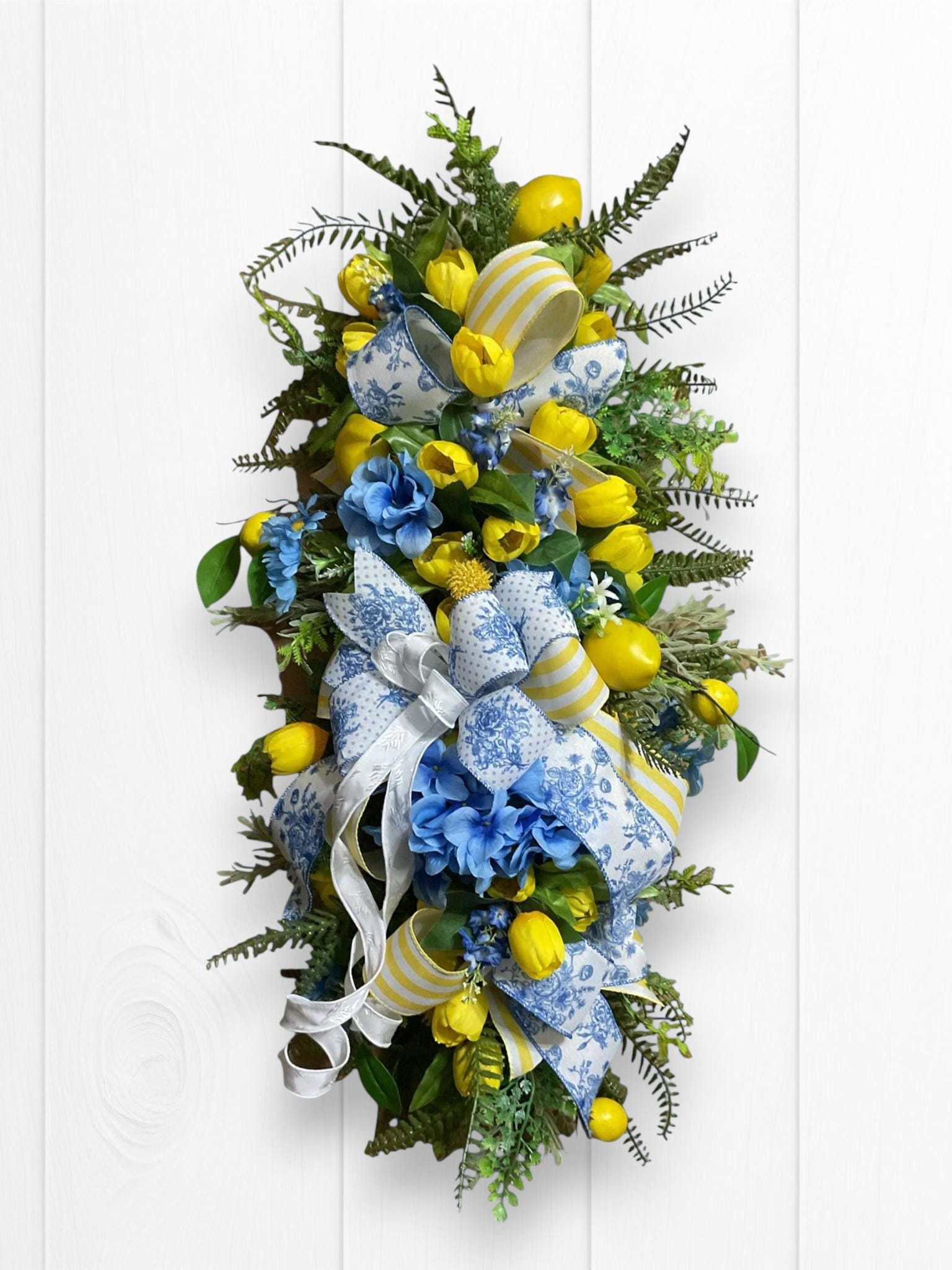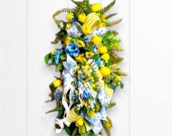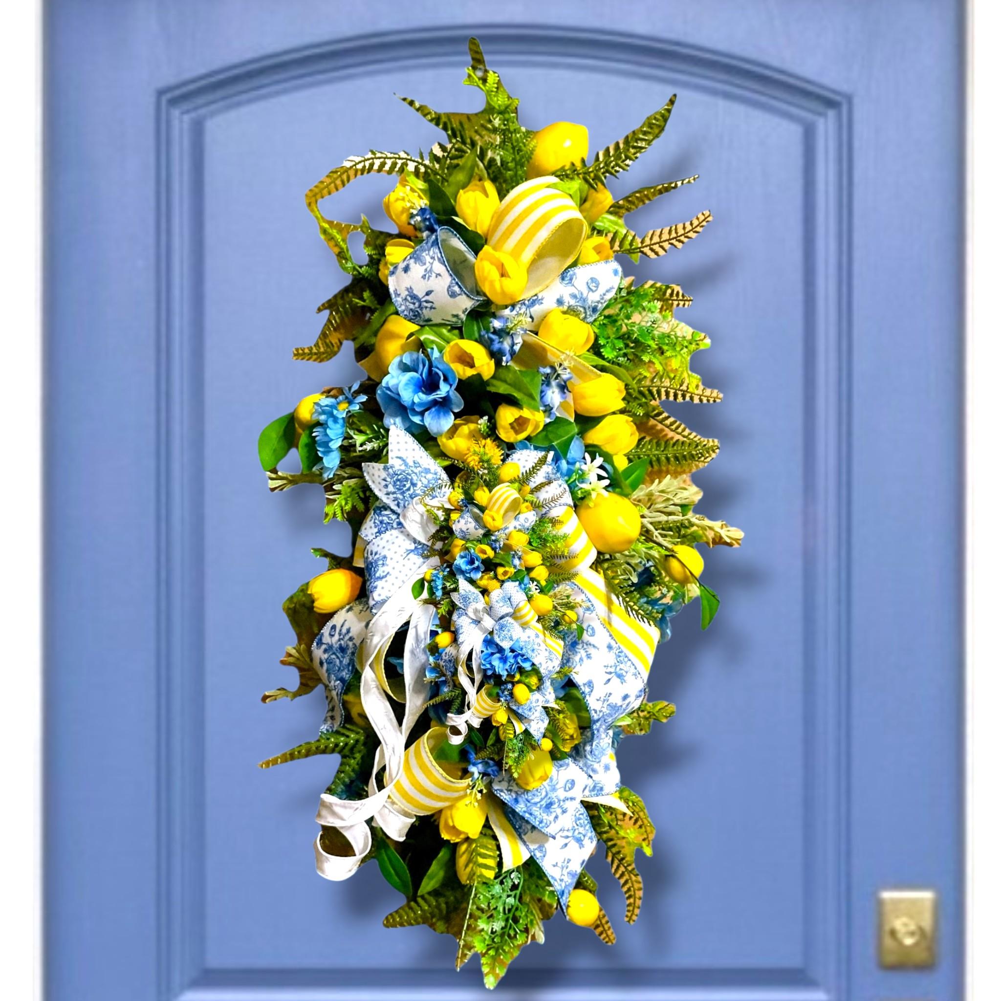 Welcome your guests with a burst of sunshine and charm! This handcrafted floral swag wreath features a cheerful blend of yellow tulips, lemons, vibrant blue blooms, lush greenery, and premium ribbons in a mix of classic blue toile and sunny yellow stripes.