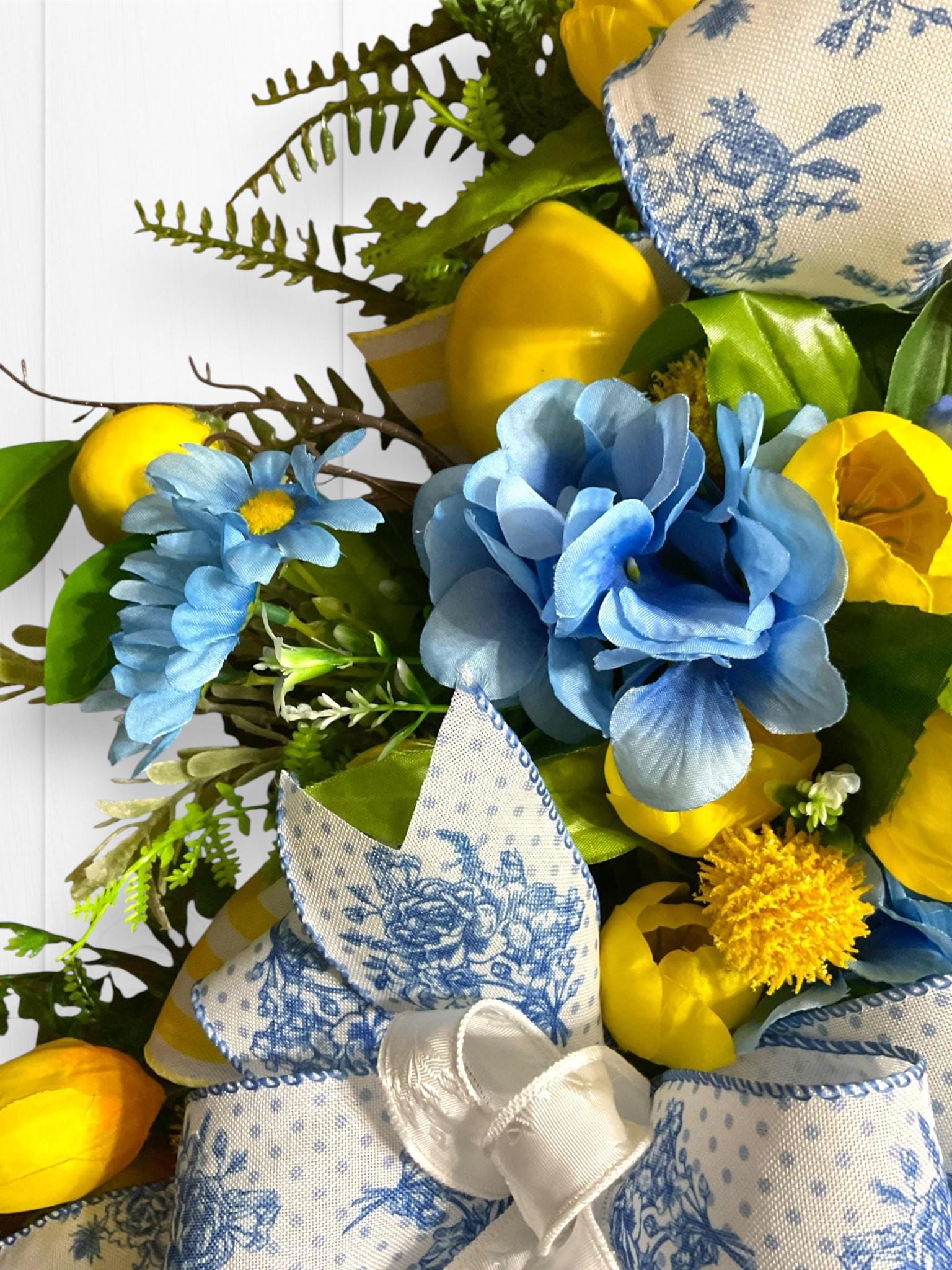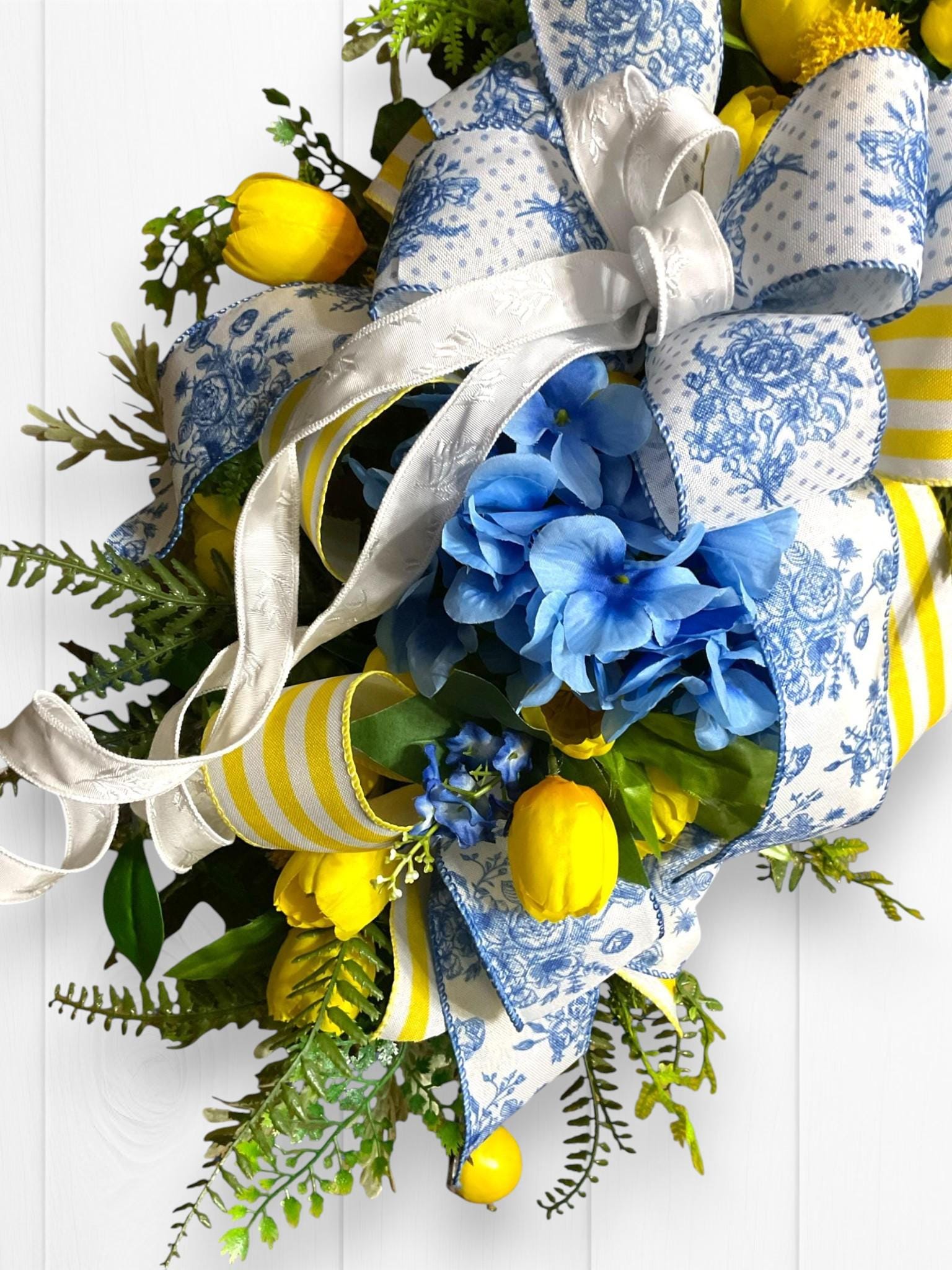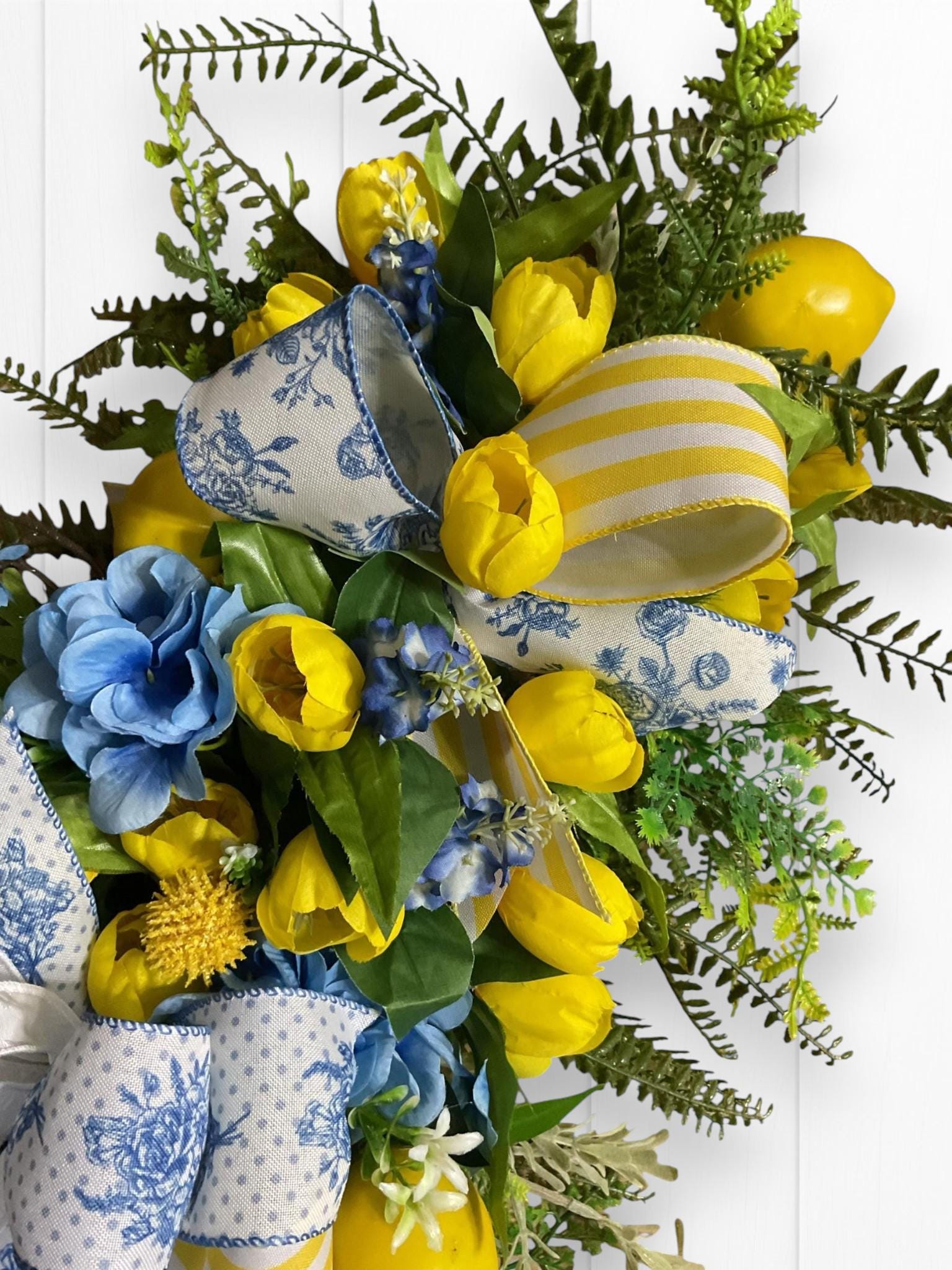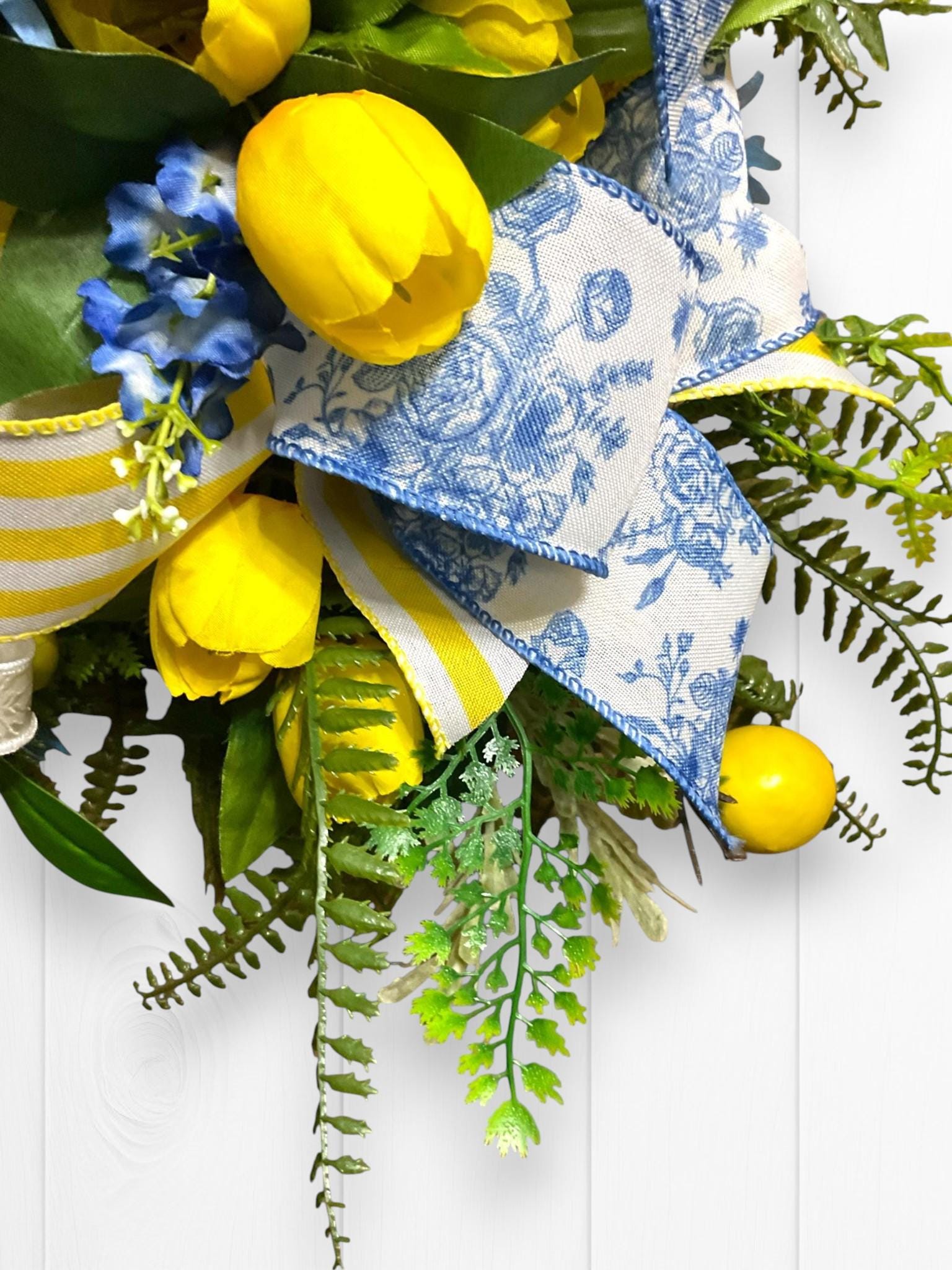 Welcome your guests with a burst of sunshine and charm! This handcrafted floral swag wreath features a cheerful blend of yellow tulips, lemons, vibrant blue blooms, lush greenery, and premium ribbons in a mix of classic blue toile and sunny yellow stripes.