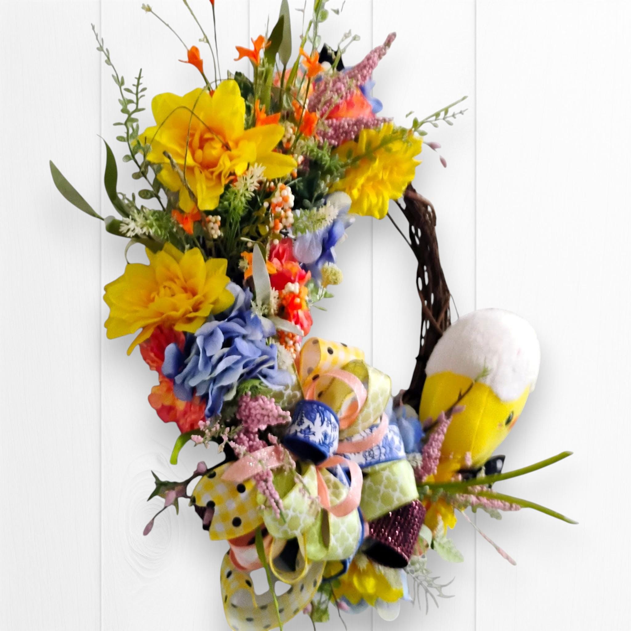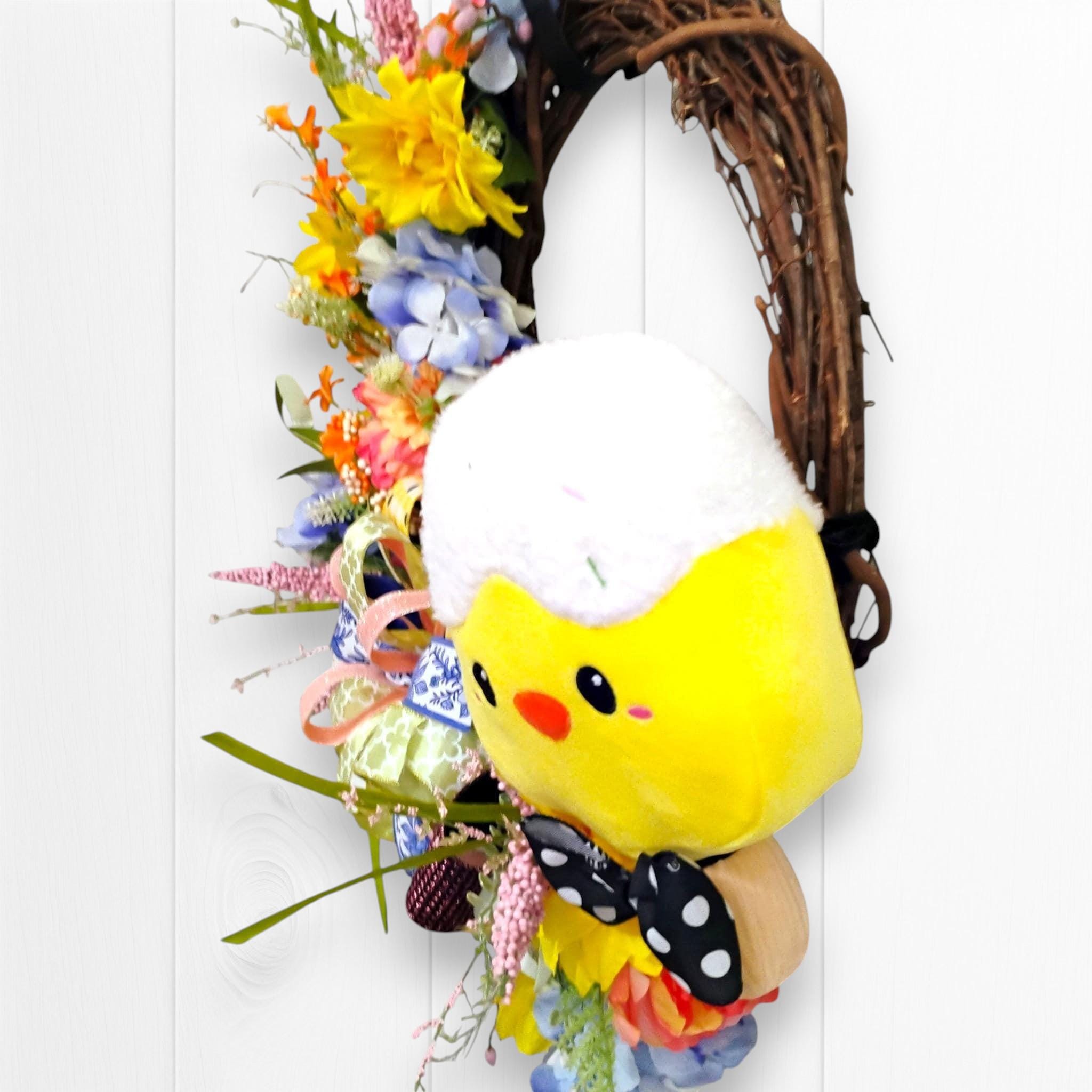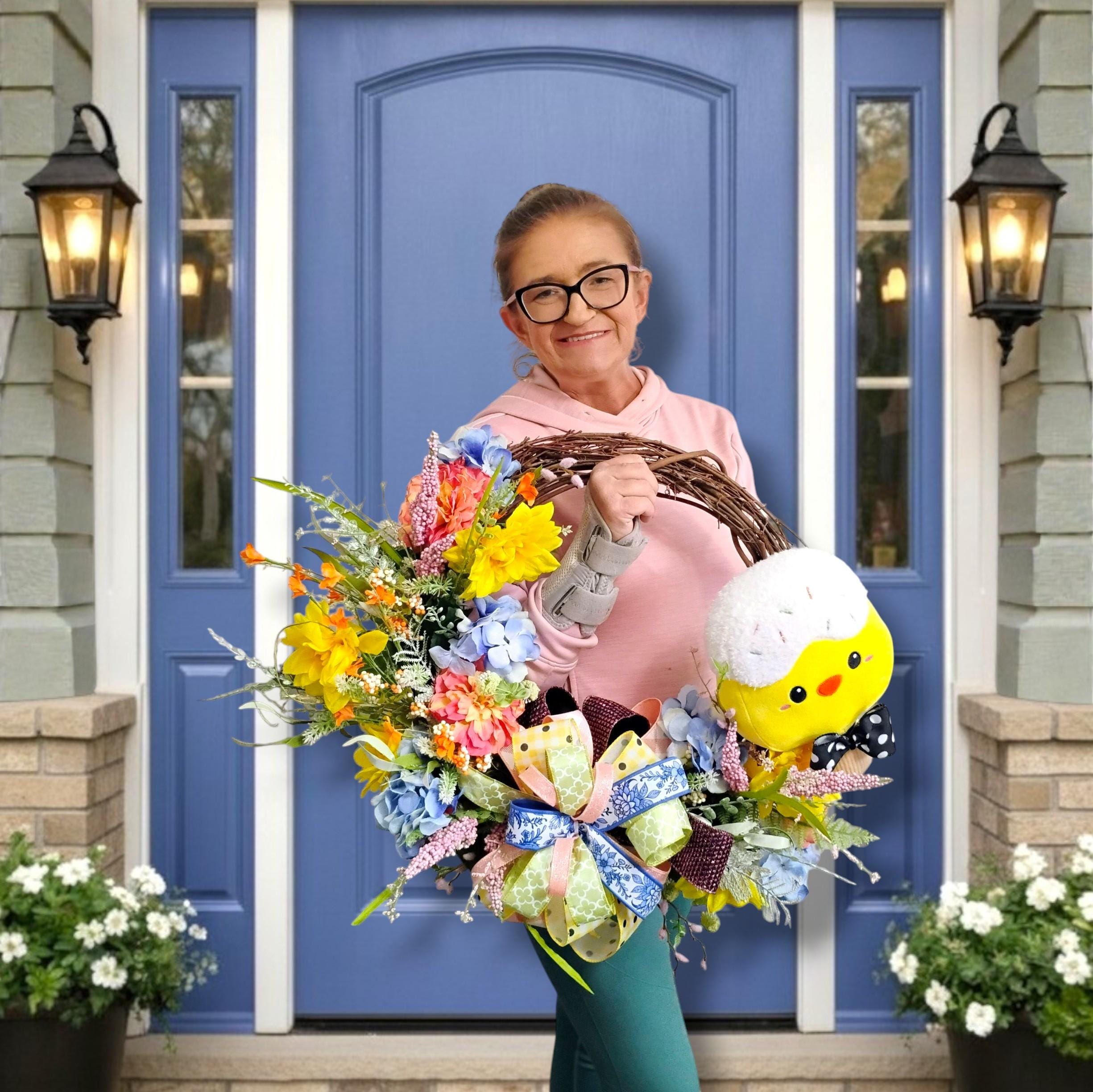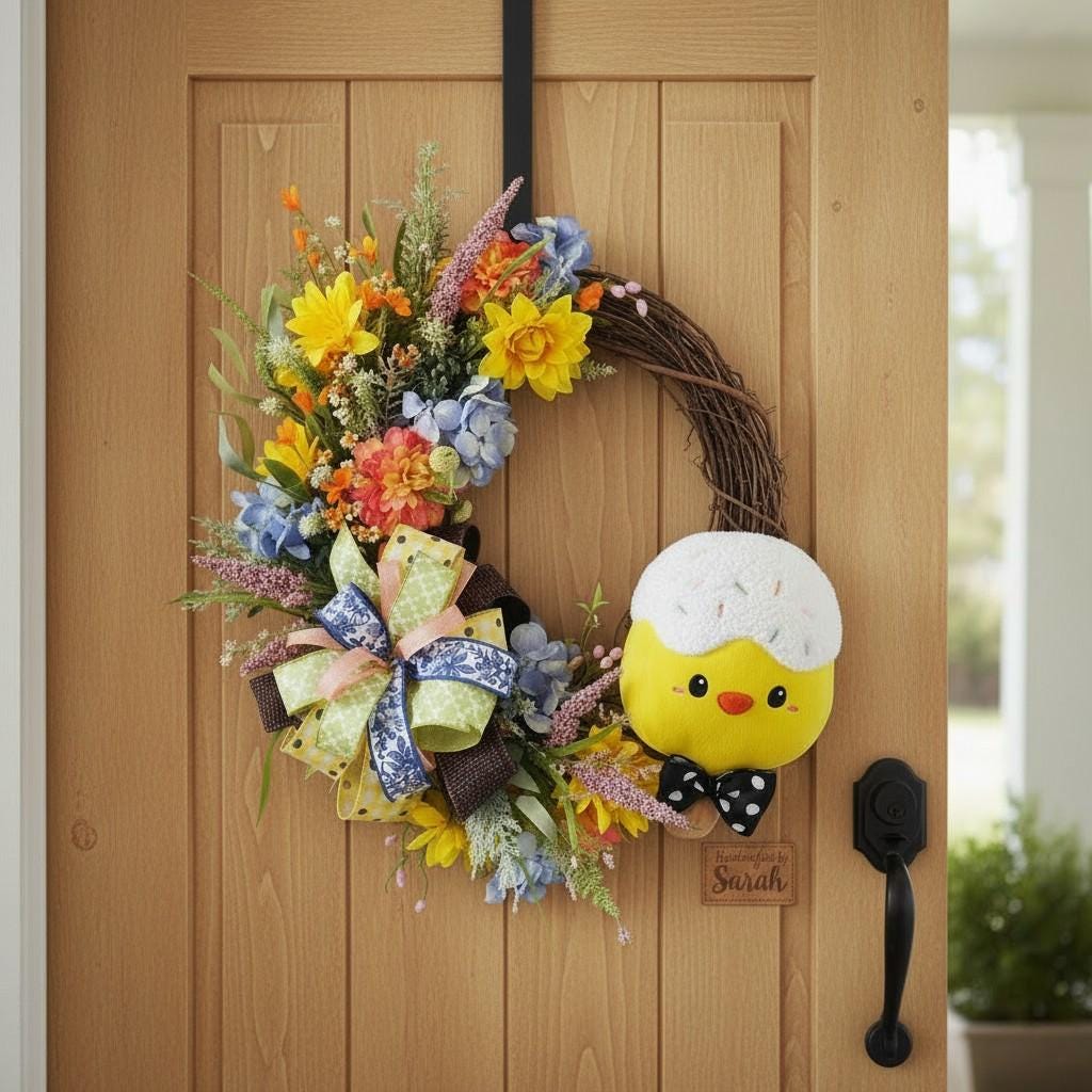 This handcrafted wreath has a full, dimensional design that stands out beautifully on a front door, entryway, or wall. The soft color palette makes it ideal for Easter decorating while still blending seamlessly into everyday spring decor.