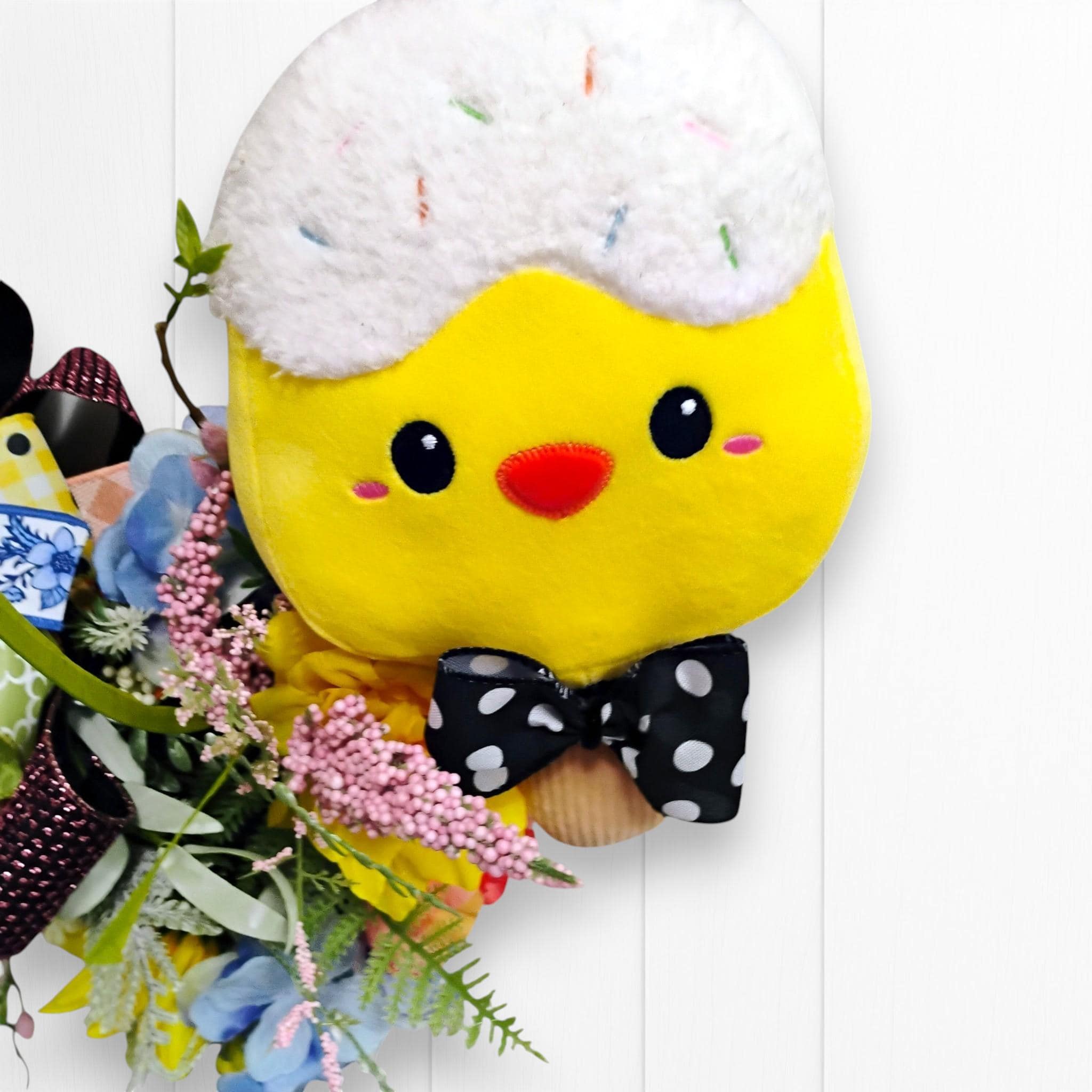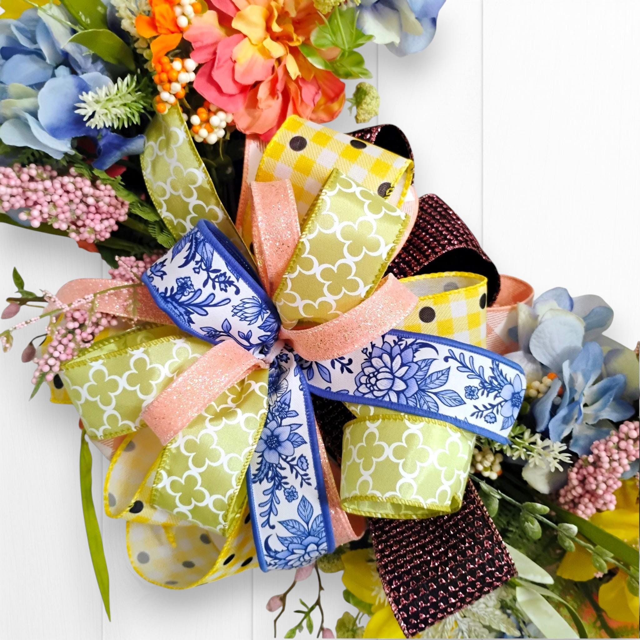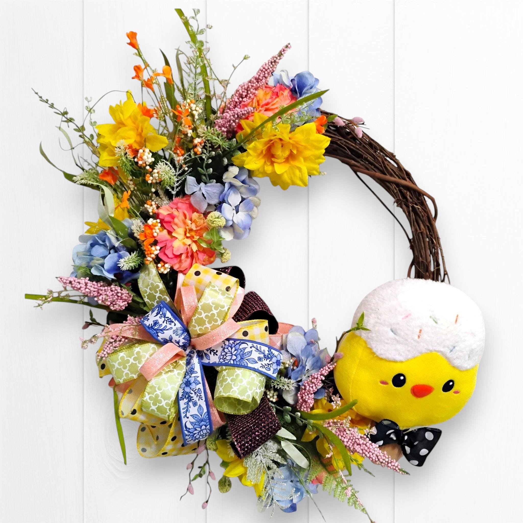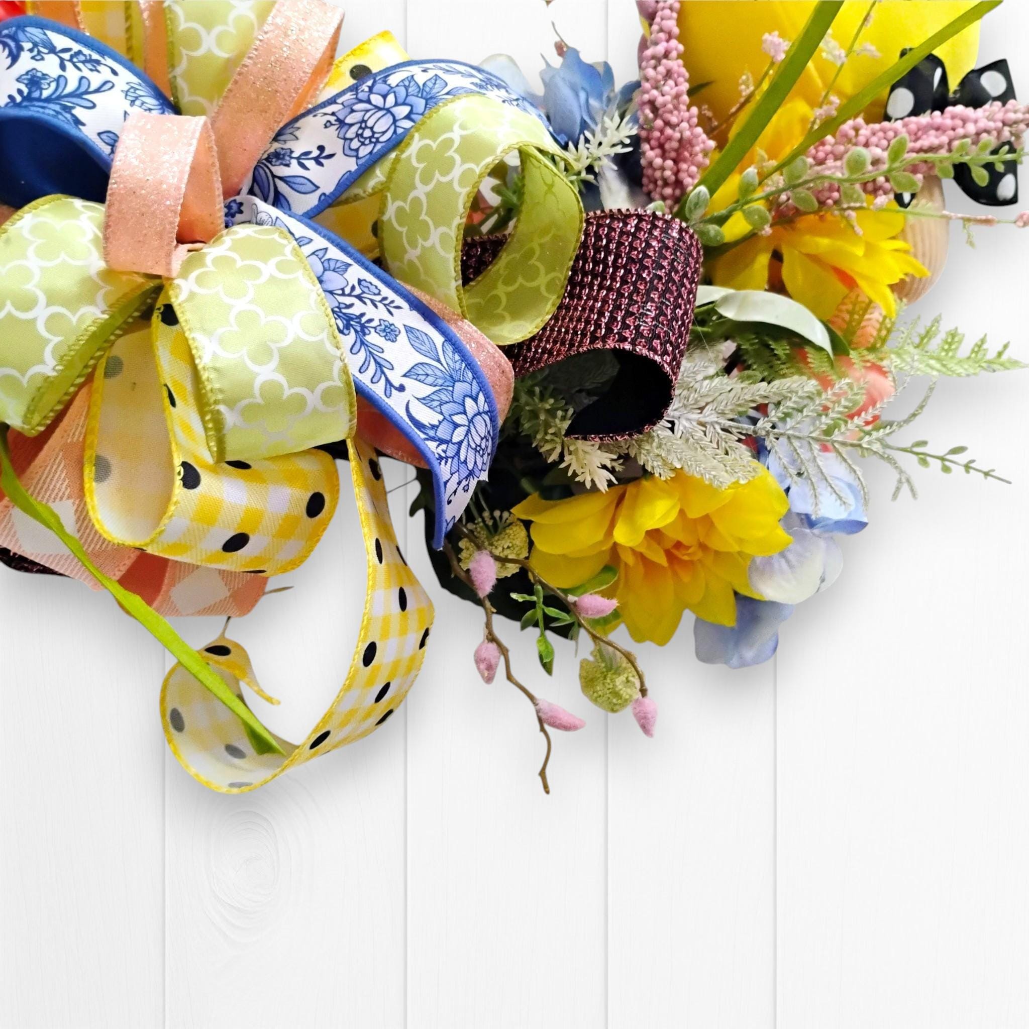 This handcrafted wreath has a full, dimensional design that stands out beautifully on a front door, entryway, or wall. The soft color palette makes it ideal for Easter decorating while still blending seamlessly into everyday spring decor.