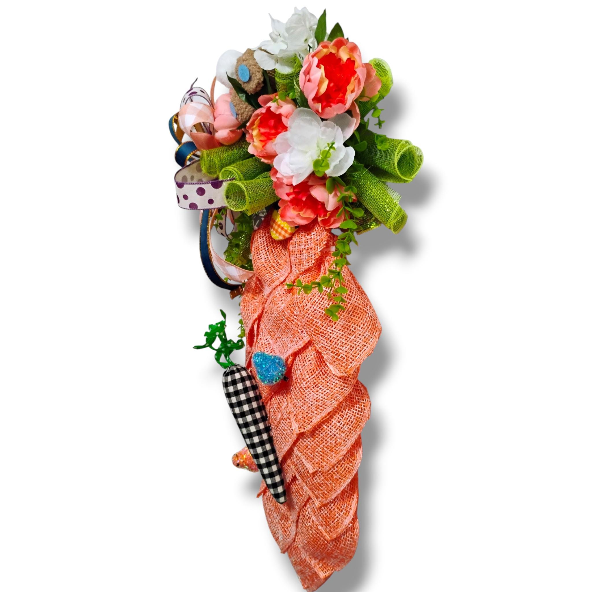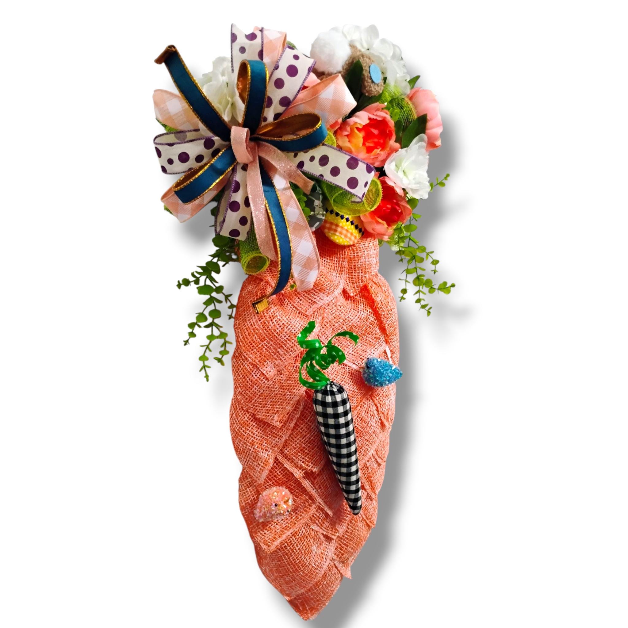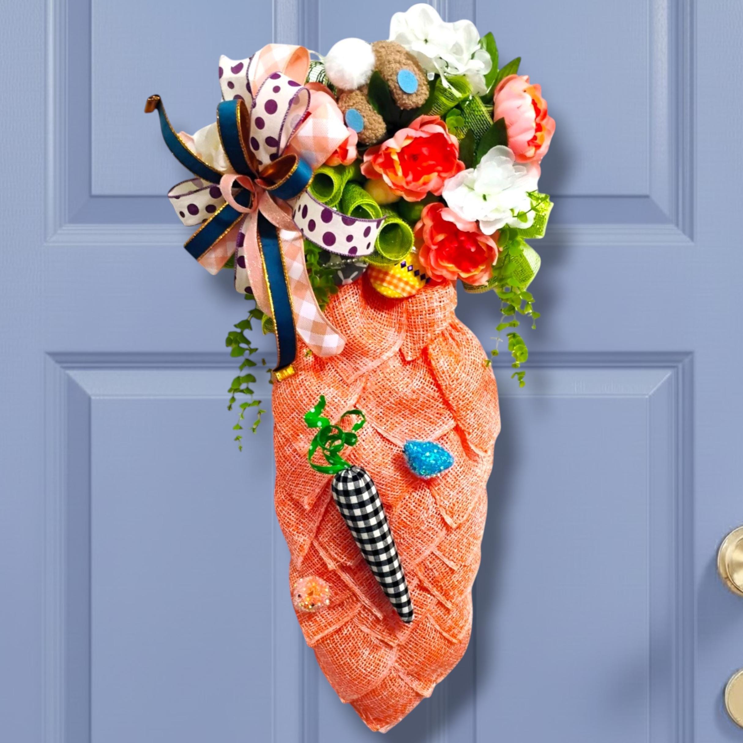 This handcrafted Easter carrot swag features a bright textured carrot design topped with spring florals, a whimsical bunny accent, and a layered designer ribbon bow. The unique carrot shape makes this wreath a fun and eye-catching decoration for Easter and spring.