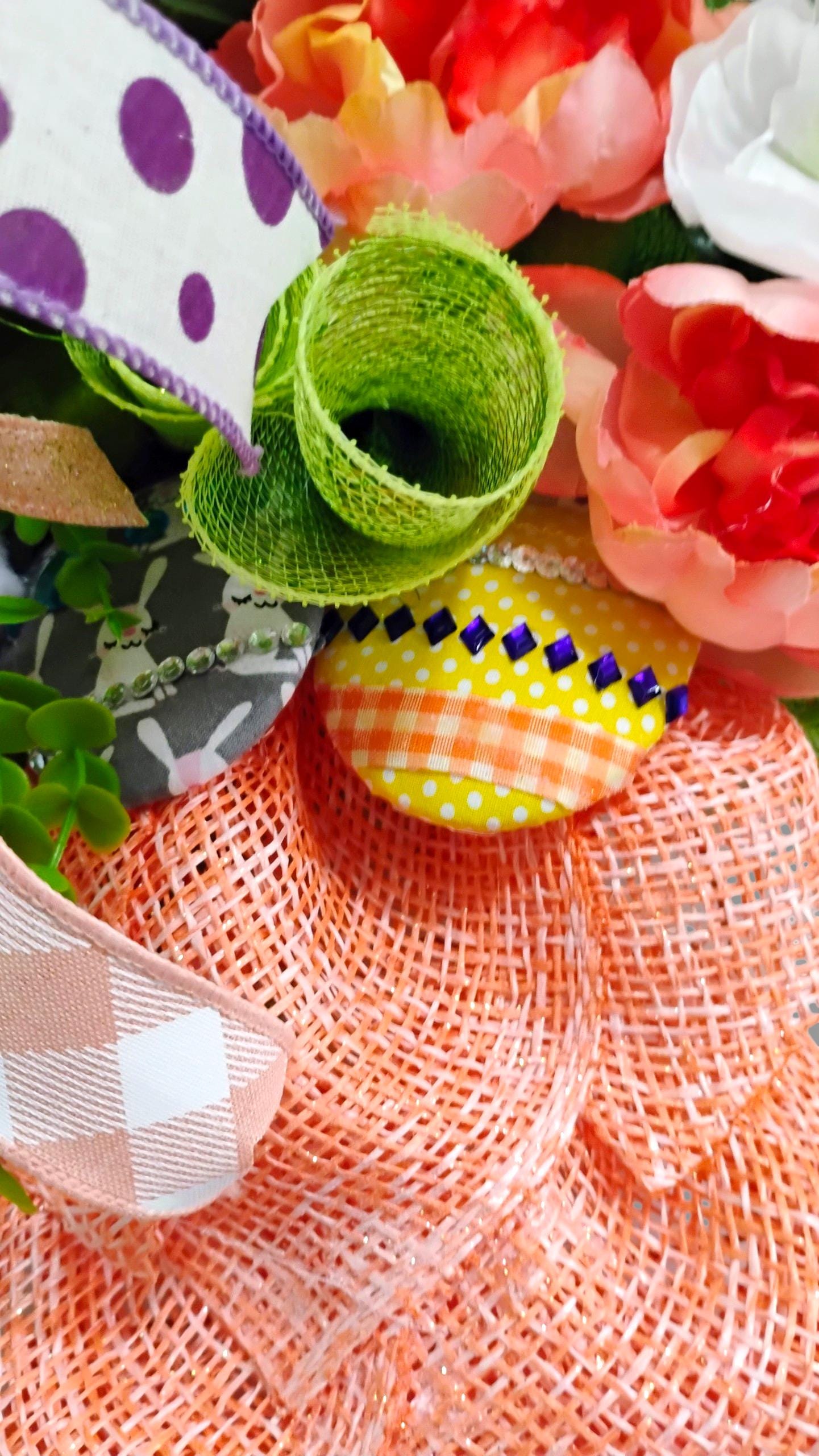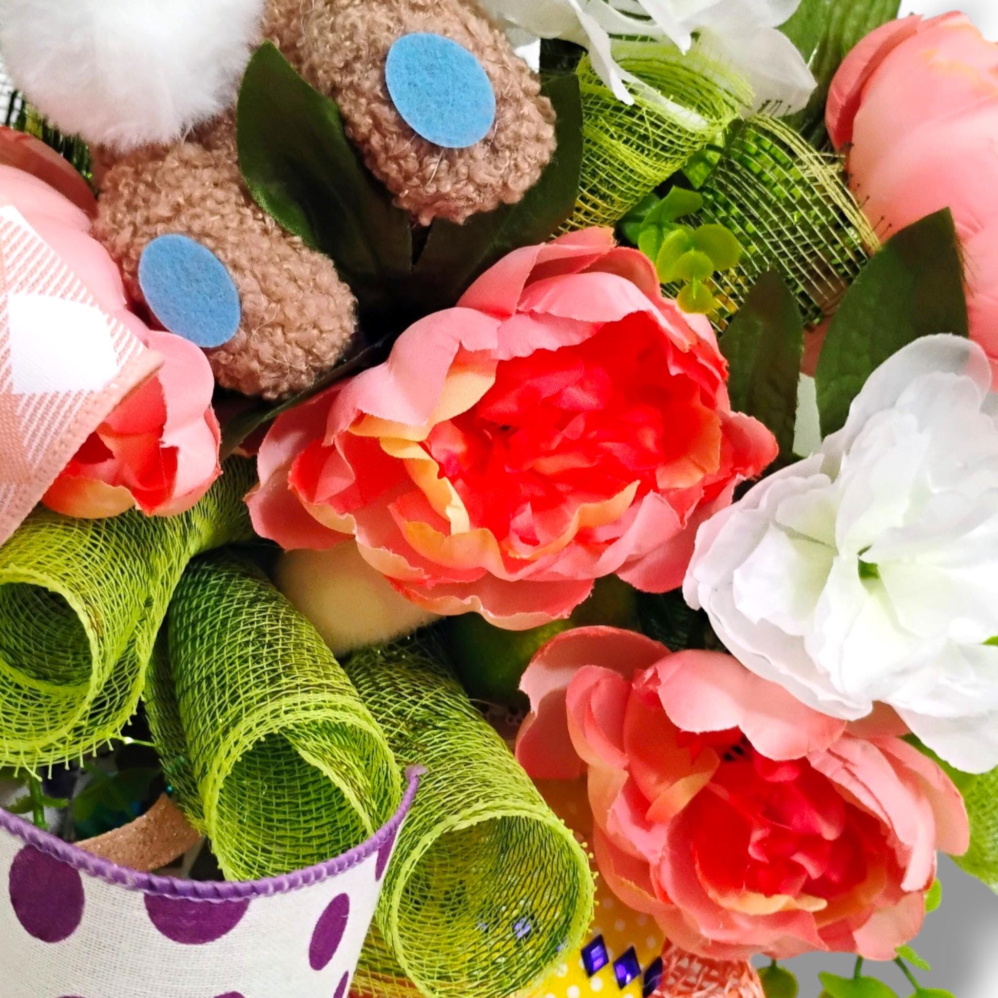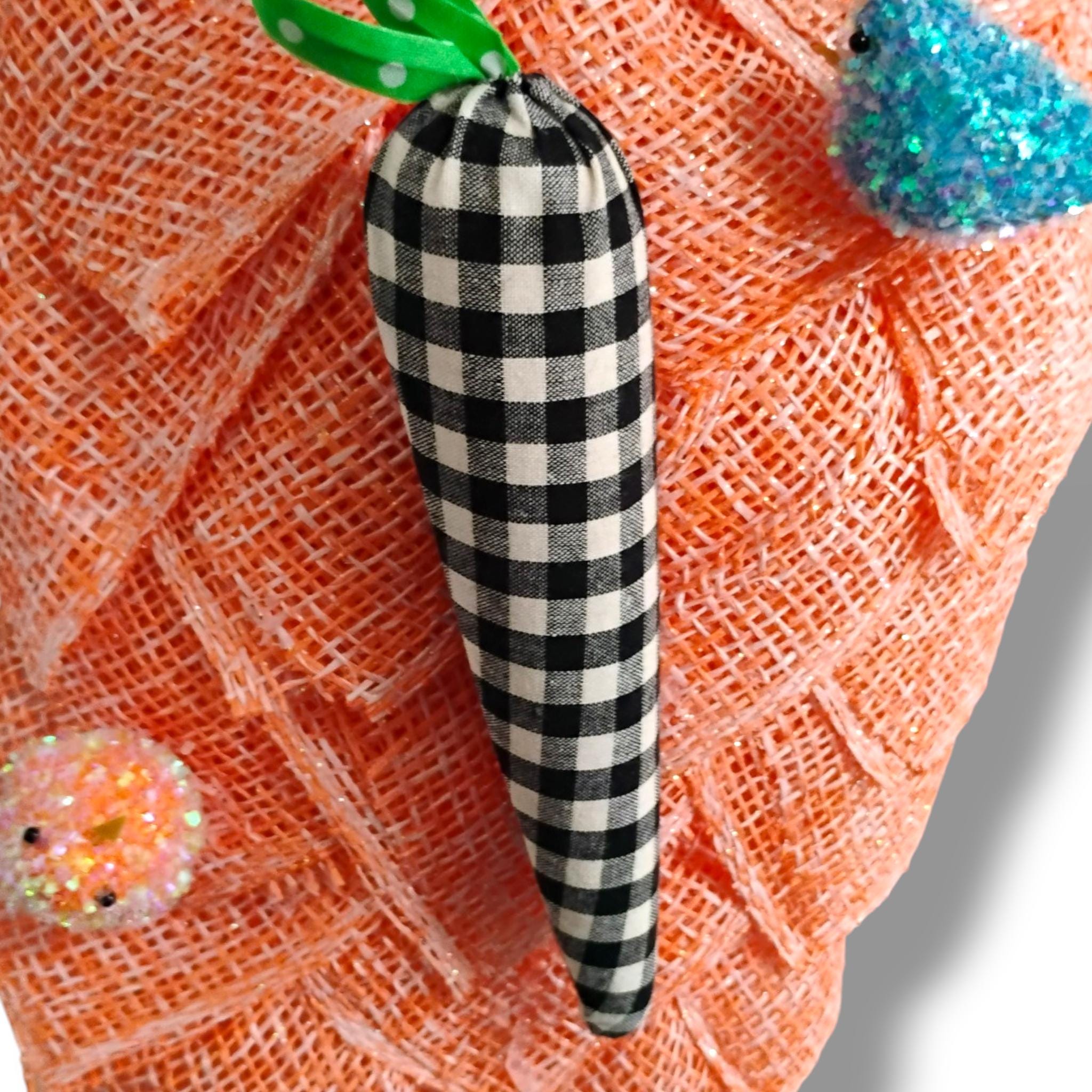 This handcrafted Easter carrot swag features a bright textured carrot design topped with spring florals, a whimsical bunny accent, and a layered designer ribbon bow. The unique carrot shape makes this wreath a fun and eye-catching decoration for Easter and spring.